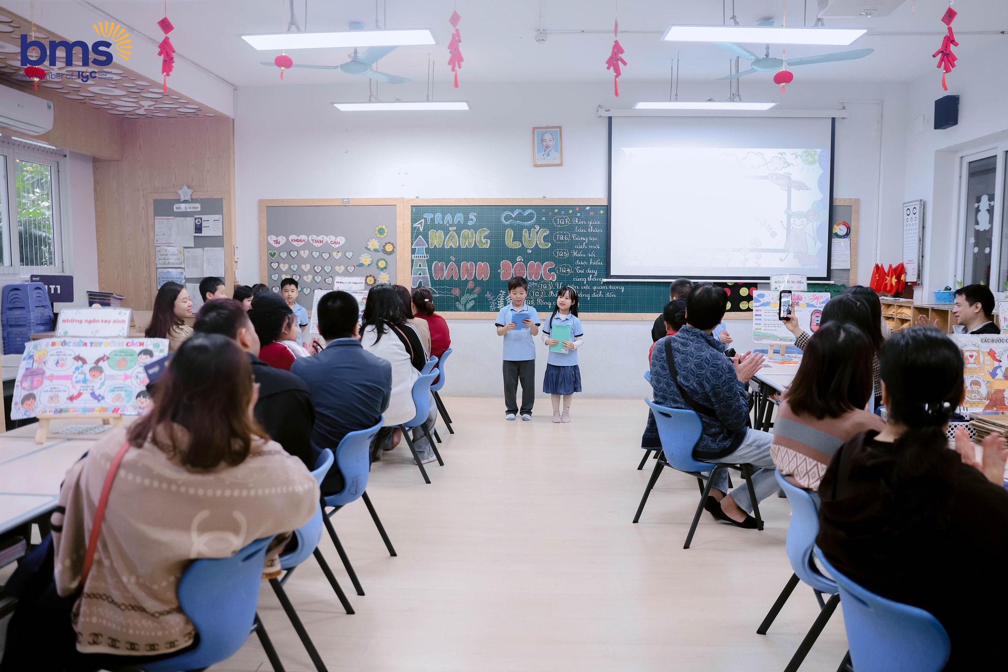 Đồng hành cùng con trong từng trạm trải nghiệm, Quý Cha mẹ học sinh không chỉ quan sát mà còn trực tiếp tham gia vào hành trình do chính các con dẫn dắt. Những ánh mắt dõi theo đầy tự hào, những nụ cười xen lẫn xúc động đã ghi lại trọn vẹn khoảnh khắc cha mẹ nhận ra sự trưởng thành của con qua cách trình bày, tư duy và khả năng kết nối với tập thể.
