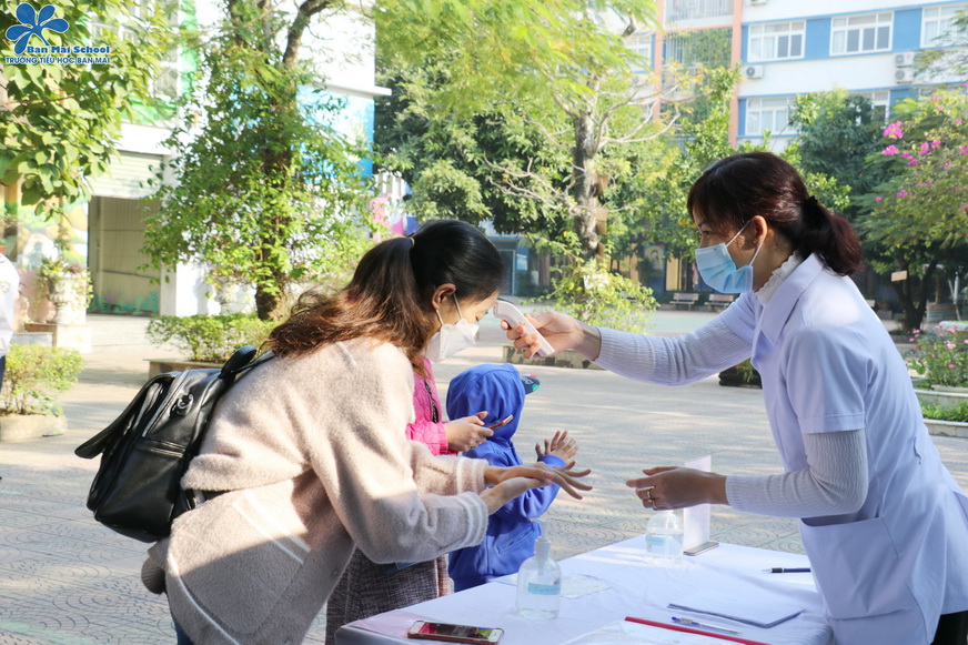 Tất cả các bố mẹ, các con đều được đo thân nhiệt, xịt tay khử khuẩn, quét mã QR ngay từ cổng trường