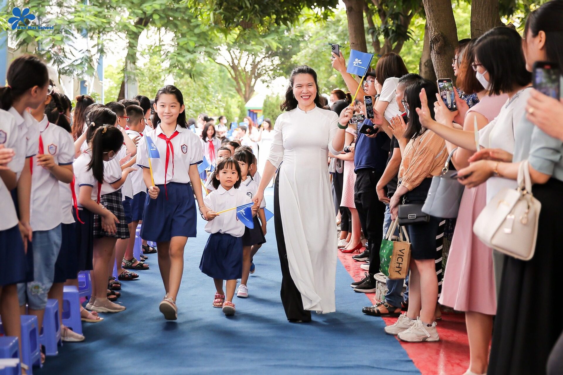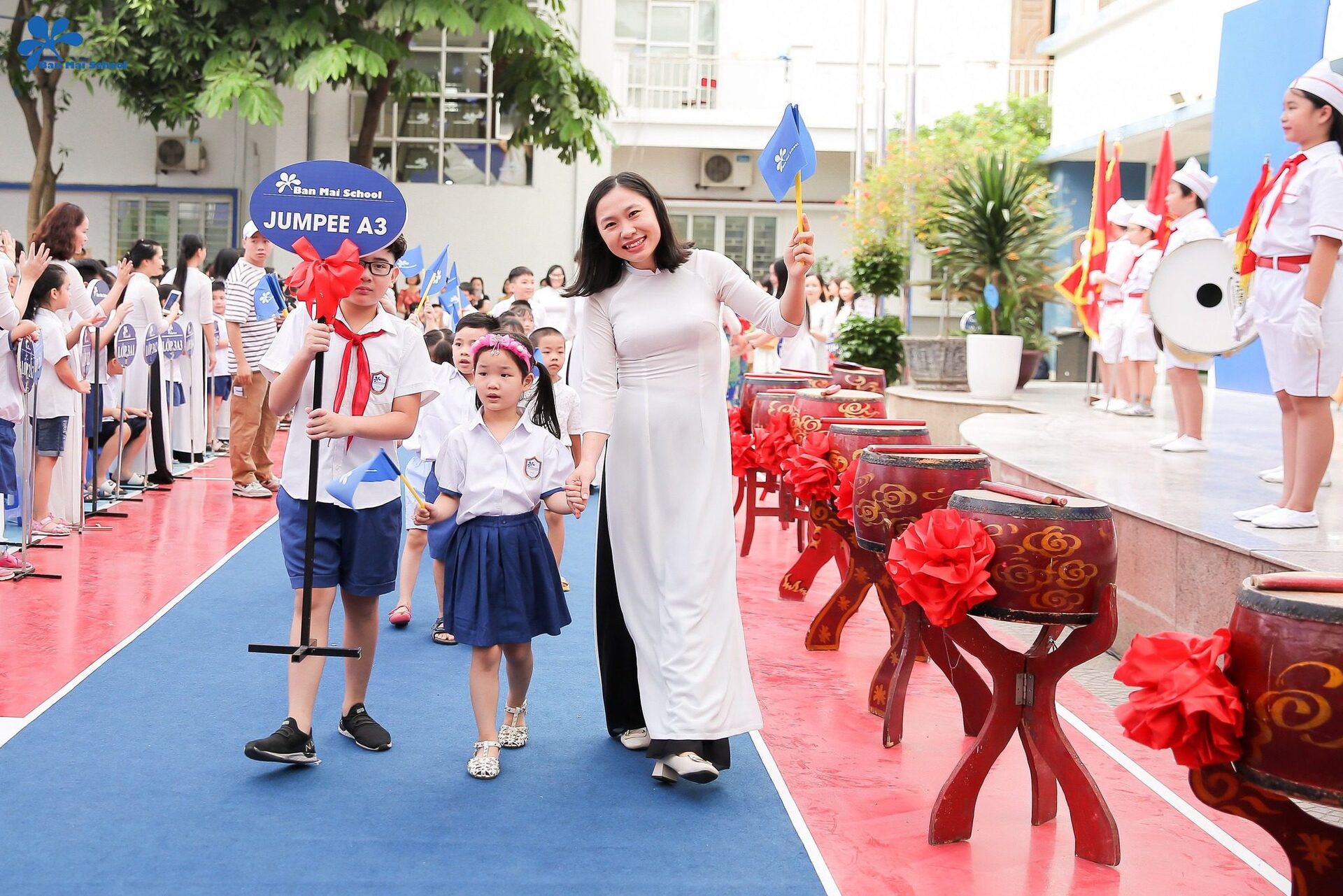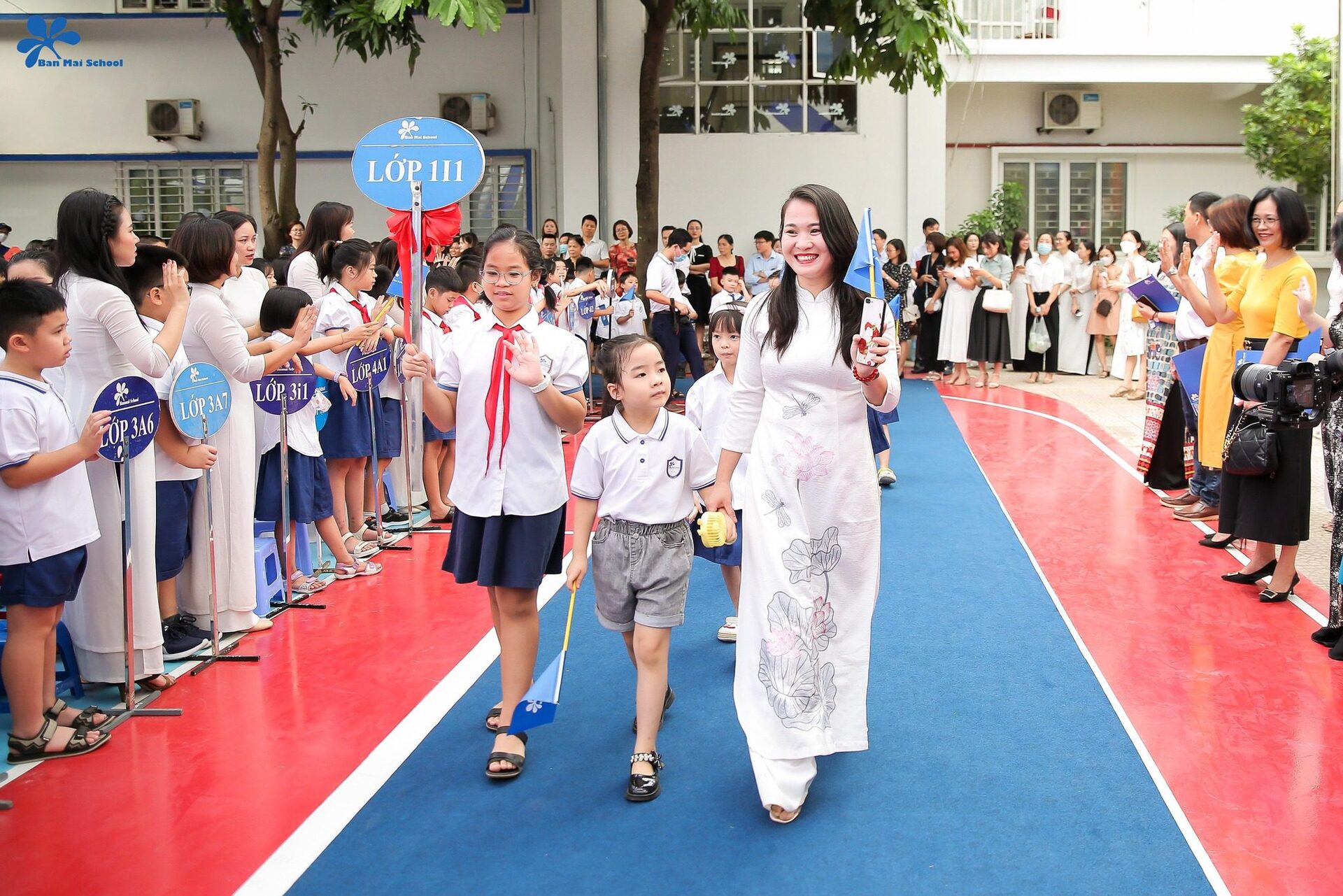 Tại Lễ khai giảng sáng nay, tất cả các con học sinh khối Jumnpee và lớp 1 đều được tôn vinh, xếp hàng diễu hành trên thảm đỏ, tiến vào lễ đài trong sự cổ vũ, vẫy chào của tất cả thầy cô và hàng nghìn học sinh toàn trường.