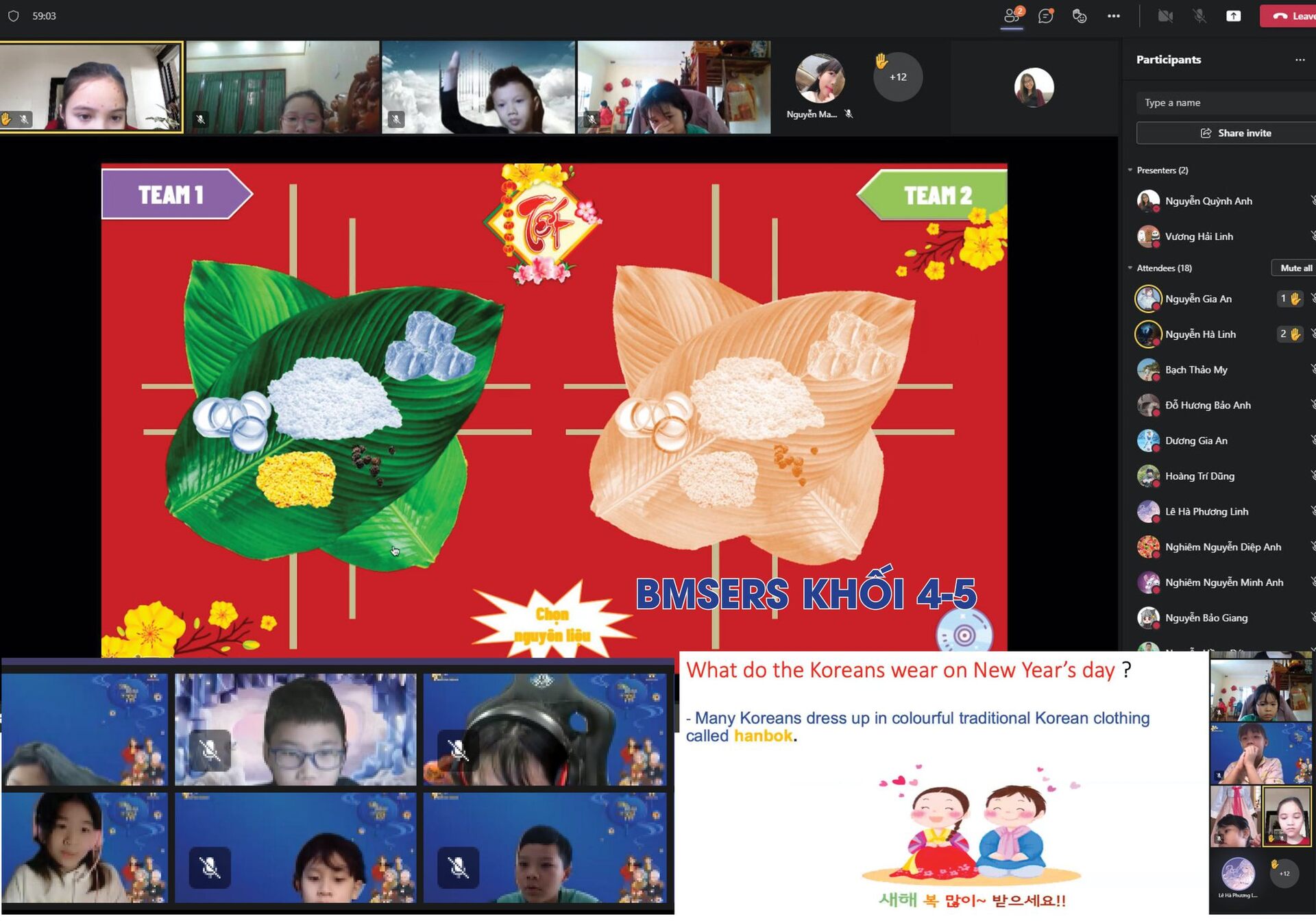 Ngày Tết cổ truyền đã quen thuộc với phần lớn BMSers, nhưng dưới góc độ môn học Tiếng Anh, các con lại được tiếp cận tìm hiểu nội dung ở khía cạnh rất mới qua các trò chơi Online, cùng những slide bài giảng với âm thanh, hình ảnh, video mãn nhãn. Nhờ đó các con có thể tự tin để chia sẻ, thuyết trình về hoạt động ngày tết cùng với bạn bè.