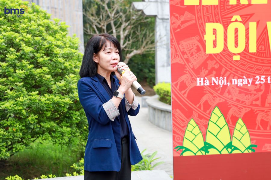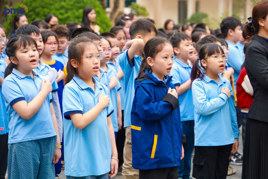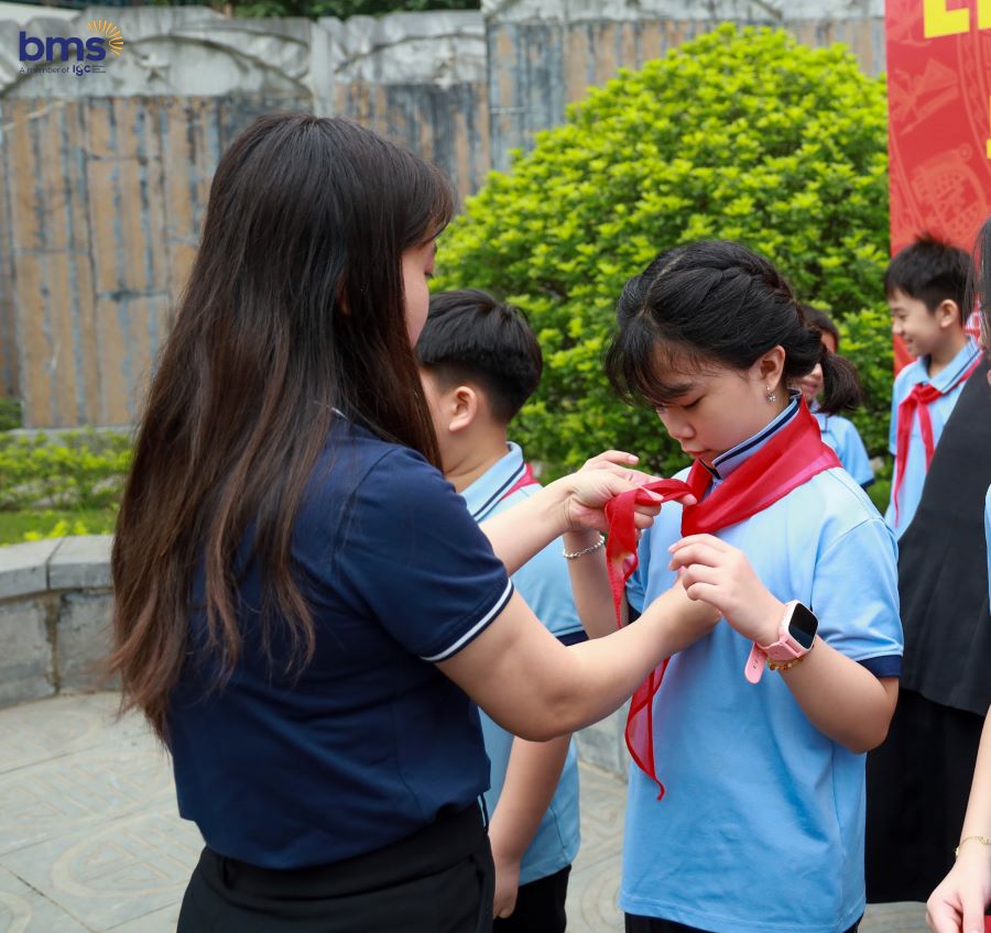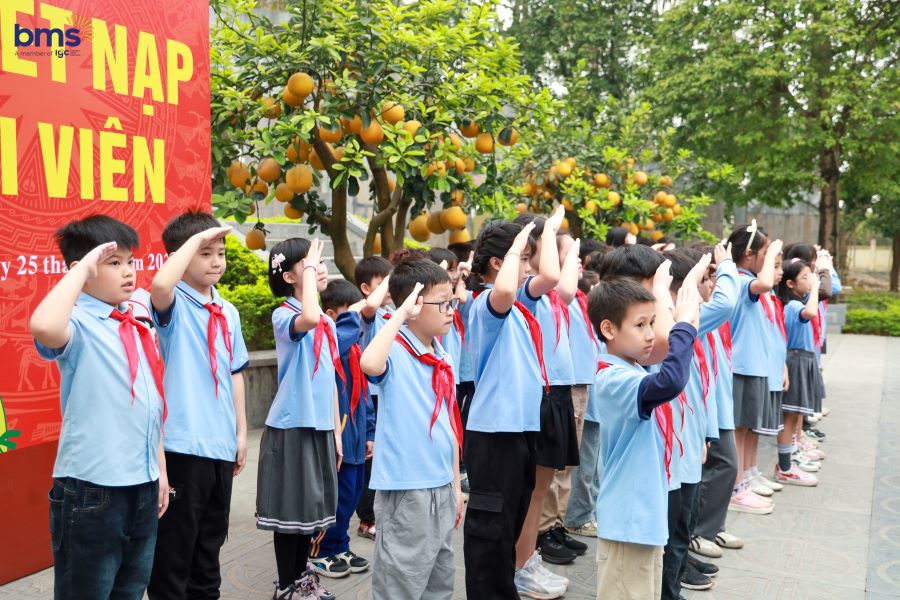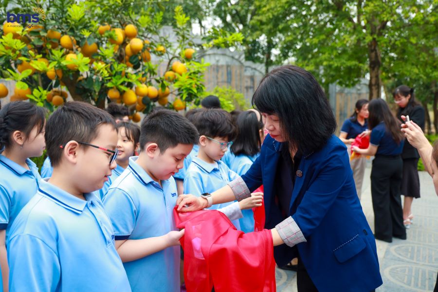 Ngay sau đó, Lễ Kết nạp Đội cho học sinh Khối 3 năm học 2024 - 2025 đã diễn ra trong không khí trang nghiêm tại Đài tưởng niệm. Khi lá cờ đỏ sao vàng tung bay trong gió, các em đồng thanh cất vang lời hứa Đội viên, tự hào đeo lên vai chiếc khăn quàng đỏ – biểu tượng cao quý của Đội Thiếu niên Tiền phong Hồ Chí Minh. Giây phút ấy không chỉ là niềm vinh dự lớn lao, mà còn là dấu mốc quan trọng trong hành trình trưởng thành của mỗi BMSer. Chiếc khăn quàng đỏ trên vai như một lời nhắc nhở, một động lực để các em không ngừng phấn đấu, rèn luyện đạo đức, trau dồi tri thức, trở thành con ngoan, trò giỏi, cháu ngoan Bác Hồ, xứng đáng với truyền thống vẻ vang của Đội.